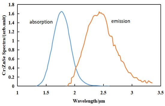 Cr: ZnSe has a relatively wide absorption band, at 1.5–2 μm; as shown in Figure 10, the absorption peak is around 1.75 μm. The emission spectroscopy is 2–3 μm, and the emission peak is about 2.45 μm []. It can be seen from Figure 10 that it is not a good choice to use the Cr: ZnSe crystal to achieve a laser output above 3 μm, because, although the crystal has emission at 3 μm, its gain is relatively low.