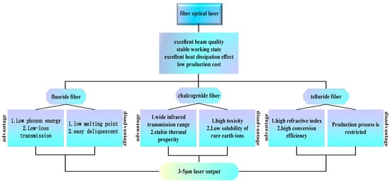 Optical fiber has many advantages in numerous fields. This paper mainly discusses the mid-infrared fiber laser with soft glass [fluoride (Er3+, Ho3+, Dy3+), chalcogenide, telluride] as the gain medium. The description is shown in Figure 11.