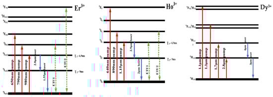 The most-used material for fluoride optical fiber is a multi-component fluoride glass called “ZBLAN”; the mid-infrared fiber laser operating at 3–5 μm band has a similar outer electron arrangement for gain ions. Energy level transitions between configurations produce abundant emission lines; the gain fiber mainly includes Er3+, Ho3+, Dy3+, and its energy level diagram [] is shown in Figure 12.