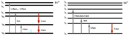 The chalcogenide glass has excellent mid-infrared transmission, thermal and mechanical properties. Compared with fluoride glass fiber, its phonon energy is lower, which makes up for the defect that ZBLAN is hindered to work at wavelengths exceeding 4 µm due to the reduction of high-energy states caused by multi-phonon transitions. In the context of the chalcogenide glass fiber lasers, the ions that have received the most attention are praseodymium and terbium. The energy level diagram [] is shown in Figure 13.