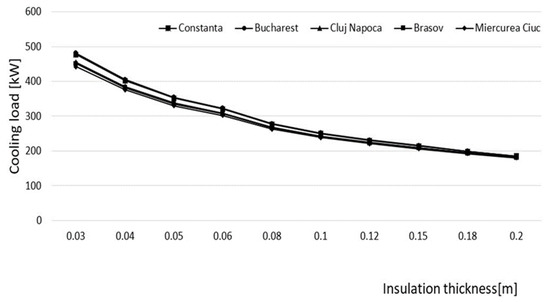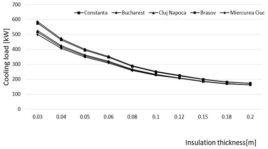 Figure 2 and Figure 3 show that the refrigerating load required to cool the storage spaces decrease with the increase in the insulating layer thickness. The transmission heat transfer dictates the cooling power decreasing trend. The cooling capacity is delivered by a vapor compression system with an air-cooled condenser.