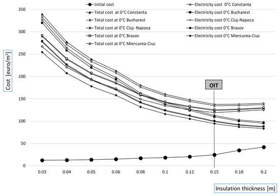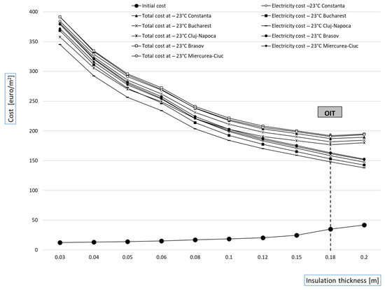 The diagrams show the variation curves of investment costs, depending on the insulation thickness, the variation curves of the electricity costs (determined by the heat transfer through building parts with thickness of the insulation), as well as the curves resulting from the sum between the investment and operating costs (i.e., electricity cost). The minimum points represent the optimal value of the OIT. The insulation cost is increasing linearly with the thickness of insulation, while the electricity cost is decreasing.