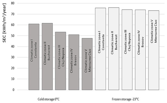 In the evaluation of the energy consumption for storage spaces, specific indicators were used, such as SEC (Specific Energy Consumption). This term was determined according to the energy consumption/m3 cooled and year for each type of storage space. The values of this indicator are represented in Figure 6, which shows a downward trend of the SEC value for cold storage, depending on the climatic zone from Romania. For frozen storage, the deviation is between 0.4… 3.6% compared to the maximum value obtained in Bucharest, which is 75.93 kWh·m3/yr. For Romania, the average values of the SEC indicator resulting from the calculation are 54.83 kWh·m3/yr for cold storage and 74.55 kWh·m3/yr for frozen storage. The average values obtained in this paper were compared with those presented by Evans [7,27] and resulted in a deviation of about 1.58% for cold storage and 4.1% for frozen storage, respectively.