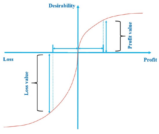 According to the behavioral economics research studies, the effect of loss on a person’s inner feeling is much stronger than profit []. Figure 1 illustrates an example of the desirability function. As a result of the introduced concepts, the curve slope is greater in the loss area than the profit area. In micro and classical economic theories, it is always assumed that an equal amount of profit or loss produces the same participation level. However, such an assumption is incorrect, considering human behavior characteristics []. In high-risk and low-risk situations, the level of loss aversion is different. It is worth noting that in high-risk circumstances, the slope of the desirability function curve is larger.