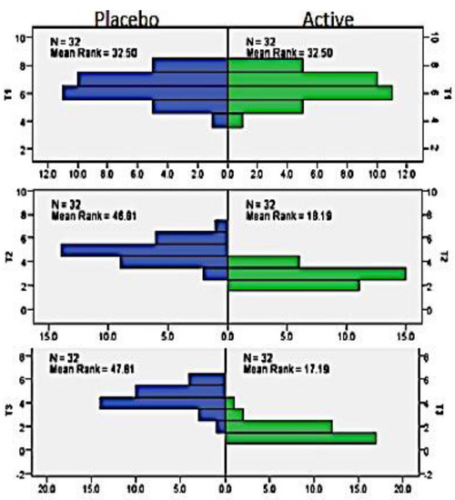 The mean age of the participants was 17.5 (±1.54), with 15 females and 17 males. A Mann–Whitney test indicated that there was no significant difference in the PP scores at T1 point of evaluation for the placebo and active groups (Mdn = 32.50). However, PP scores were significantly different at T2 point of evaluation for the active group and placebo groups were Mdn = 18.91 and Mdn = 46.81, respectively, at the end of the 1st week after treatment, U = 54, z = −6.302, p < 0.00. Similarly, at the end of the 4th week after treatment, there was a significant difference in PP scores at T3 point of evaluation for the active group (Mdn = 17.19) and placebo group (Mdn = 47.81), thus indicating a predictable beneficial effect of the active group U = 22, z = −0.6730, p < 0.00. The results of mean rank score in the active group indicate that the pain perception reduced over time, i.e., from T1 to T3, suggesting a reduction of pain perception by the participants over a period of time (Figure 1 and Table 2).