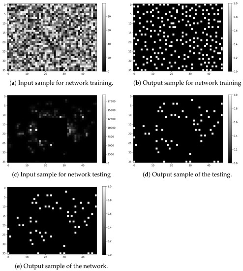 Therefore, the dataset used for the training of the first network needs to reflect significantly the two possible cases of the ruleset function in any numerical value scale. Hence, each input test sample is generated as a two-dimensional grid of the same size as the calorimeter, with uniformly distributed random values from 0 to 99. This range of values was chosen, taking into account the statistical number of ones that appear on a sample. Regarding the maximum number of local maxima that can fit in a sample, which is one fourth of the total cells, we consider one sixth of the total cells as a good estimation on the number of local maxima that can be on a sample to make sure that some maxima occurrences happen to be adjacent in some cases. The random generation with values from 0 to 99 happen to match these conditions. For reference, the range of values of the calorimeter goes from 0 to MeVs. Each expected output test sample is then generated with the application of the ruleset function of the CA on all the cells of the input sample. As a visual example, Figure 2 shows a sample of the input and expected output the network is trained with. Given that we want the network to learn to reproduce the CA ruleset on the calorimeter data, the testing samples are raw data samples of the calorimeter with the corresponding readout cell values. The expected output of the testing samples is obtained again with the application of the CA on the training input samples. The last image (d) on Figure 2 shows the image generated by the trained neural network when it is given image c at the input.