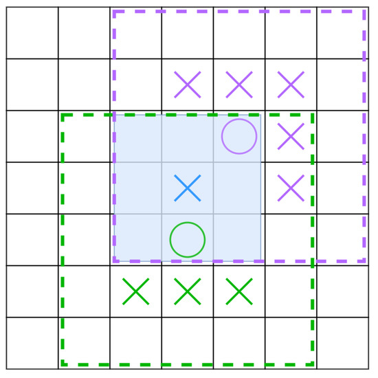 At this point, the ruleset function for this step defines the fractioning of a cell’s energy in case of overlap in Equation (3). In the same equation, num_clusters refers to the number of local maxima that could be causing overlap. As an example, if we look at the purple circle in Figure 3 to account for num_clusters, the positions marked with a purple X should be checked.