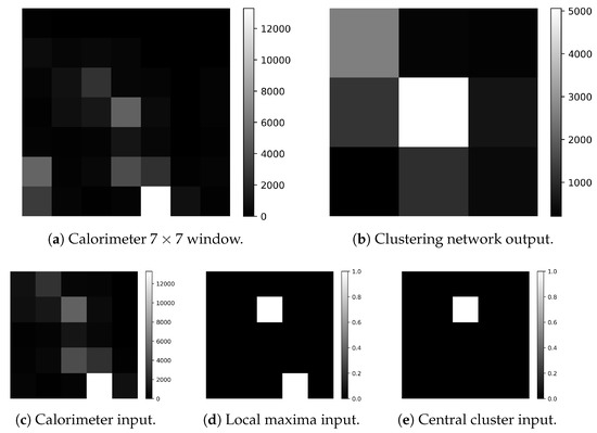 Samples of the data used for the training of the clustering and overlap network. The three streams of data (c–e) are extracted from the analysis of a window (a). Image (b) shows the output predicted by the network representing the reconstructed cluster located at the centre of the (a) sample.