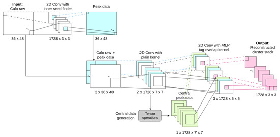 Aiming to provide a detailed overview of the structured proposal, gathering the relations between the neural networks and the data, Figure 5 shows the entire dataflow of the reconstruction process for the inner calorimeter region. The diagram starts with the list of energy cells transformed into an image and ends with the list of reconstructed clusters. For the other two regions, the structure is maintained, but the shapes of the constructed images adapt to each region size.