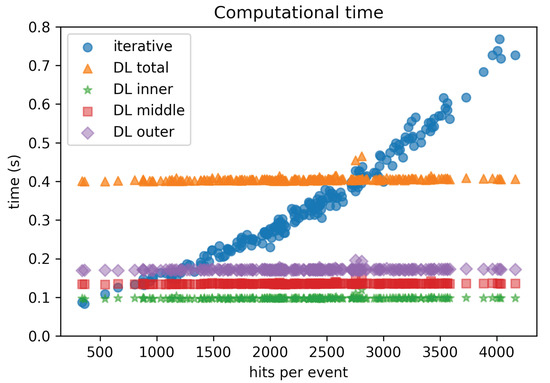 Results, in terms of computational performance, are measured as the time in seconds elapsed between the reading of the readout cell values, and the generation of the list of clusters for the three regions of the calorimeter. The execution of both methods was done using a single thread in each case. Figure 6 shows a plot of the computational time for the number of energy cells (hits) on a single sample of a calorimeter simulation (event). The time plotted is measured as a mean of one hundred iterations on the same event for 200 different events. Looking at the curve from the Python version of the LHCb algorithm (iterative), it performs really fast in events with a low number of energy cells. However, it shows a clear quadratic growth with the number of cells activated. On the other hand, the deep learning approach (DL total) shows nearly constant behavior towards the number of cells. Although it has a small positive slope of , the tendency shows to be linear. Even so, around of the events processed in the testing have less than 2575 energy cells and, therefore, stay under the time performance curve of the deep learning approach. Even so, we achieved a constant computational time with independence of the event complexity.