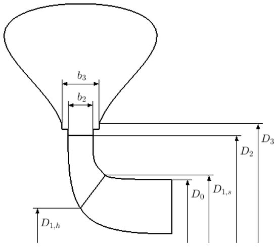 Initially, quantities at the impeller outlet are computed, i.e., the impeller diameter, , the blade height, , the outflow area, , the meridional velocity , the blade velocity, . The breadth ratio, , is first evaluated as