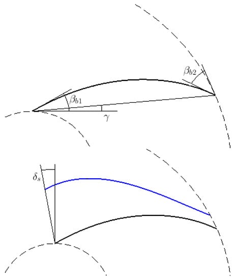 where is the distance in the meridional direction (the blade leading edge is taken as origin), and represents also the ordinate, r is the distance from the rotation axis, and is the wrap angle, defined as