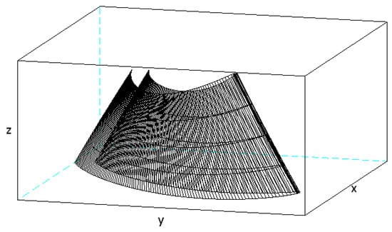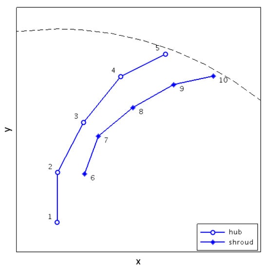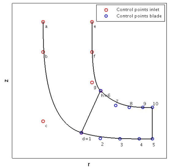 The axial position of the control points 1, 2, 6, 7, i.e., , , and (see Figure 4) can be derived from and are used to define the two Bézier curves adopted to represent the hub and the shroud for the meridional channel. The points 3, 4, 5 are fixed at and points 8, 9, 10 at to obtain a radial outlet. The inlet channel before the blade is controlled by four control points: d and h correspond to the leading edge at the hub and shroud; points a, b, c and e, f, g are aligned in order to guarantee an axial inflow; furthermore, the axial position of points c and g is set to guarantee the continuity of the derivative of the meridional channel at the leading edge for both the hub and shroud.