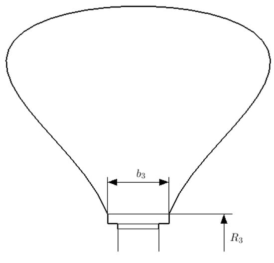 As reported in [], the vaneless diffuser dimensions, the baffle tongue angle, and the area of the cross section at the volute outflow strongly affect the volute performance. The parametrization is based on 4 DVs. In particular, from , the outlet radius of the vaneless diffuser, , and the diffuser width, (see Figure 7) can be obtained. includes the baffle tongue angle, , and the cross section area at the volute outflow, (see Figure 8).
