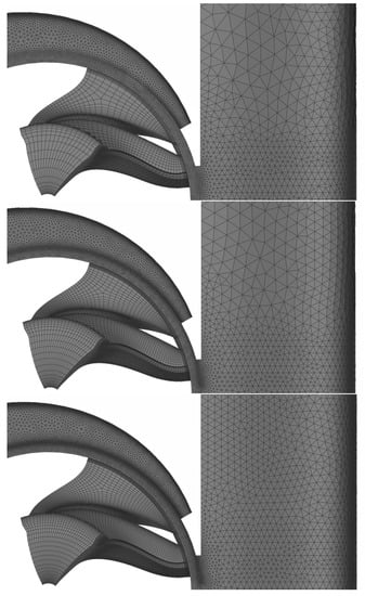 A mesh convergence study has been performed for the baseline geometry, using three grids with the number of elements ranging from 0.83 M to 3.09 M. In particular, Figure 9 shows a detail of the coarse (top-left), medium (top-right) and fine (bottom) mesh, while Figure 10 shows details of the impeller and volute medium mesh for the baseline geometry. The grid convergence study is summarized in Table 4, where the predicted pressure rise and efficiency are reported. As suggested by the convergence study, the grid with 1.53 M elements (medium) ensures a good compromise between computing time and accuracy of the results, and, therefore, it is chosen for the optimization.