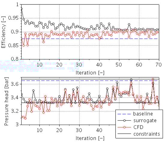 where is the error of the surrogate in evaluating the objective functions , i.e., the efficiency and the pressure head, with respect to the value f predicted by the CFD simulation. The convergence is considered to be reached when ( in this work) for at least ten iteration, and the maximum efficiency is not changed.