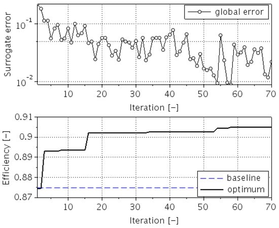 Figure 12 shows the optimization convergence in terms of efficiency and pressure head. The SBO reaches the convergence after 68 iterations. Both values predicted by CFD and estimated by the Kriging model are reported. Figure 13 deeply investigates the optimization process in terms of the global error (see Equation (2)) and the achieved maximum efficiency. The global error shows a decreasing behaviour, while the efficiency reaches a value above 0.9 starting from 16-th iteration. The optimum design is characterized by , i.e., an improvement of 3% with respect to the baseline is achieved, and bar.