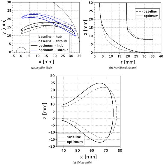 Comparison of the baseline and the optimal design for the impeller, the vaneless diffuser and the volute. is the impeller efficiency, C the torque absorbed by the pump shaft, the static pressure variation, the total pressure variation, the pump hydraulic efficiency.