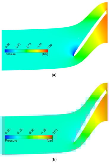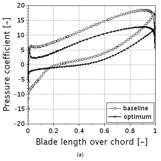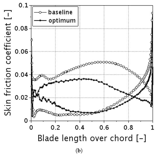 Initially, the effect of the impeller blade geometry is investigated, comparing the pressure coefficient, , and the skin friction coefficient, , along the blade (see Figure 16) for the baseline and the optimal geometries. The coefficients are defined as follows: