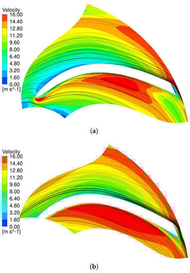 The flow in the meridional channel is analyzed in Figure 19. The velocity contours show a more uniform distribution along the span in the inlet pipe and inside the impeller for the optimal geometry. This is obtained with a modification of the hub and shroud profile, as shown in Figure 15. In particular, the reduction of the section at the end of the inlet pipe avoids the stall at the hub. Moreover, at the impeller outlet the velocity peak is reduced and the velocity distribution is more uniform along the blade height.