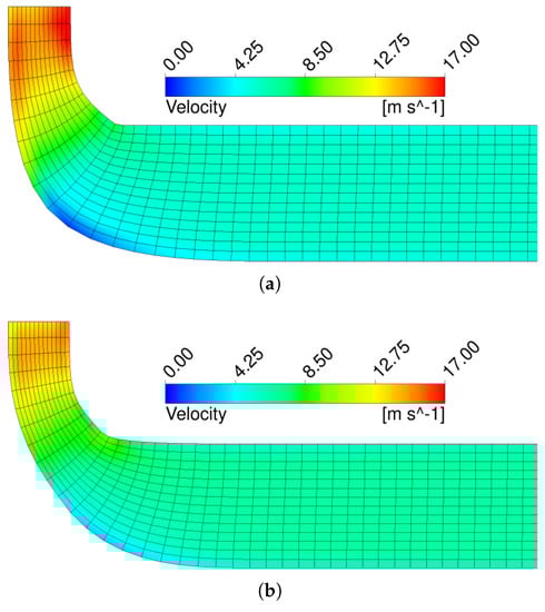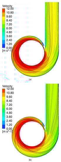 Velocity contours and streamline in the plane z = 5 mm for the baseline (a) and the optimized (b) geometries.