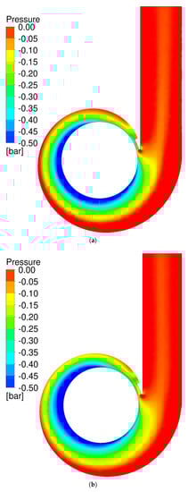 Static pressure field in the volute at 4 mm for the baseline (a) and the optimized (b) geometries.