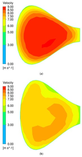Velocity field at the volute outlet for the baseline (a) and the optimized (b) geometries.