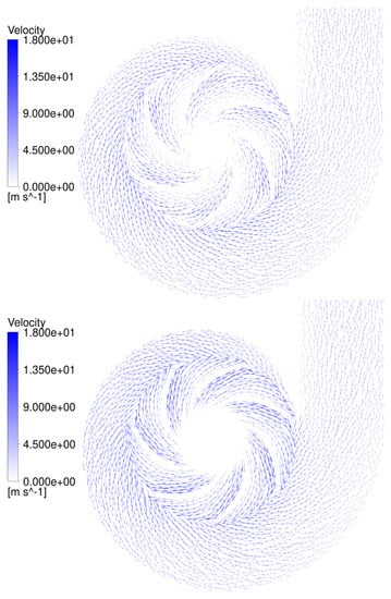 Velocity vectors (relative velocity for the impeller and absolute velocity for the volute) for the baseline (top) and the optimized (bottom) geometries, 5 mm.