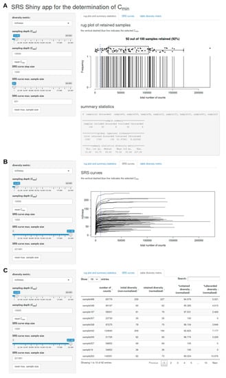 - an interactive table with sample names and the number of counts per sample as well as the initial diversity (non-normalized), retained diversity (normalized), %retained diversity (normalized), and %discarded diversity (normalized) of the selected alpha diversity metric in response to the selected Cmin (Figure 1C).