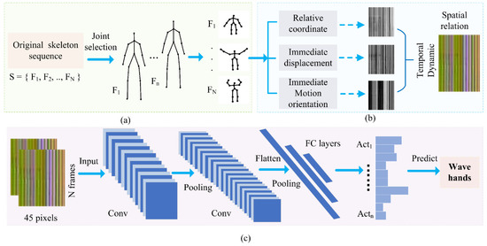 Li et al. [16] selected three joints as reference points to obtain new joint coordinates and transformed them into RGB images for fine-tuning the pretrained VGG19 model. Huynh-The et al. [17] designed an image encoder to transform the original coordinate data to image-formed data. Nevertheless, both methods ignored the temporal information, which is important in describing human motions. To consider temporal dimension information, in [18,19], the authors encoded spatial-temporal information to motion images based on joint trajectory maps (JTMs). Although the two methods have added temporal features and achieved competitive results, it inevitably loses important information due to the issue of overlapping joint trajectories.