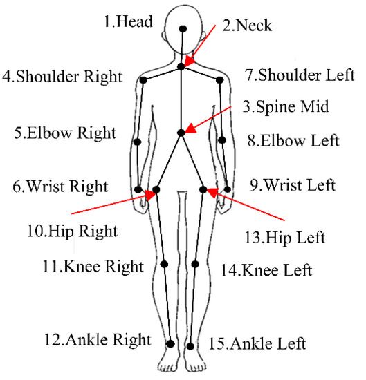 Therefore, for the purpose of eliminating redundant information and ensuring the accuracy of classification, the 15 joints labelled in Figure 2 are adopted in the proposed method.