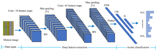 Based on the above analyses, a shallow CNN model is designed to extract the deep features of the generated motion images. Figure 3 shows the detail structures. Our proposed model consists of two convolutional layers with a kernel size of 3 ∗ 3, two max pooling layers with a kernel size of 2 ∗ 2 and three fully connected layers. In particular, rectified linear activation (ReLu) is employed in our network. Compared with saturation nonlinear functions, such as sigmoid, ReLu has a faster convergence rate, which can overcome the vanishing gradient problem and decrease the computing time [27]. In addition, two batch normalization layers have been added between the convolutional layer and max pooling layer, because it can normalize the output of each layer to have a mean value of 0 and variance of 1, which speeds up the training and convergence of the network. Furthermore, the batch normalization layer could replace the Dropout and L2 regularization [28]. For it has a regularization function to prevent overfitting and maintain the generalization ability of the network.