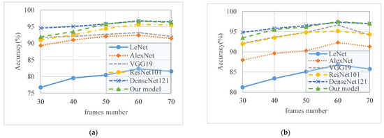As shown in the Figure 4, there are recognition results of multiple classical CNN models and our model training on images generated by data augmentation with different frame numbers on two datasets. In the charts, the X-axis represents the frame number, and the Y-axis is the classification accuracy. When the number of frames, N, is 30, the classification result of each model is at the lowest point, such that the accuracy of LeNet is 76.74% and 81.24% on the two datasets, respectively. As the number of frames increases, the accuracy of the models also increases until N = 60, reaches the highest value, and then the accuracy drops somewhat. Hence, the frame number N of each skeleton sequence is unified to 60 and the size of the generated motion image is fixed to 45 ∗ 60.