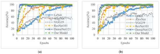 All models are trained with the same batch size = 128, training epochs = 100, optimizer (Adam with a fixed learning rate of 0.001), and cross entropy loss function of PyTorch [31]. On the two datasets, we follow the standard leave-one-out cross validation configuration, in which ten percent of samples are used as the test set and the remaining samples are the training set. The experiments are implemented on a desktop computer with an NVIDIA GTX-3060 GPU and Intel Core i7-11700KF 3.60 GHz processor.