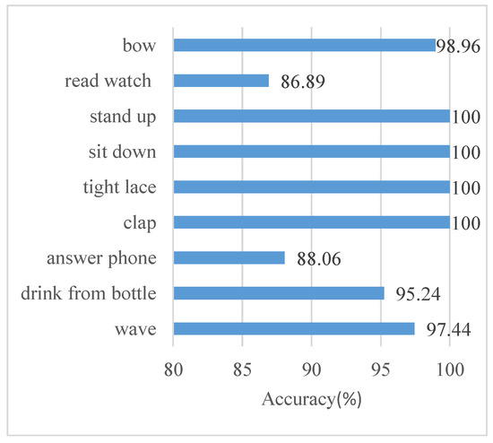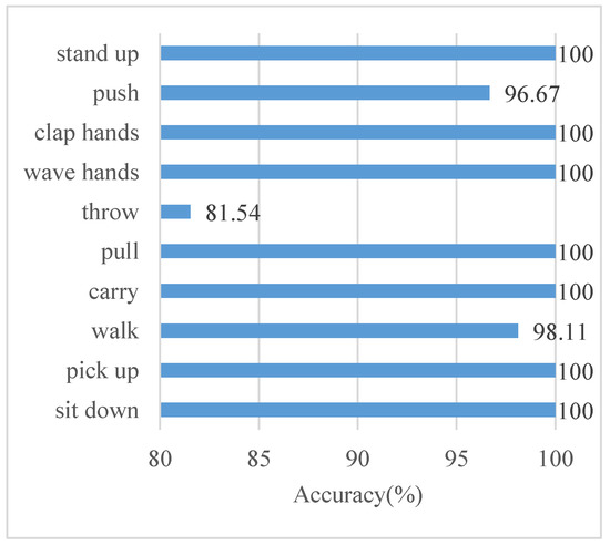 Although our method achieves competitive results, it still has shortcomings. Figure 6 and Figure 7 describe the recognition results of each action on Florence-3D and UTkinect-3D using our method separately. As shown in Figure 6, answer phone and read watch are the two actions with the lowest recognition, at only 88.06% and 86.89%, respectively. We consider the reason for this phenomenon to be that without considering external objects, some actions are so similar that they will be misclassified. For example, answer phone may be classified as drink from bottom because both movement processes are raising one hand to the head. The key poses are exhibited in Figure 8. For the action, the read watch swings one hand to the chest, similar to the swing of two hands on the chest when clapping, so the test result is not ideal. Similarly, in Figure 7, the action throw is incorrectly detected as pull. From the perspective of skeleton sequence, both actions push one hand far away, but judging from the images, things fly out of the hand during the throw actions.