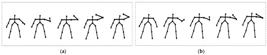 where denotes the 3D coordinates of the i-th joint in the j-th frame, with . The number of matrix rows represents the duration of an action execution. Keeps the number of columns fixed, and increasing or decreasing the number of rows can slow down or speed up the execution of an action. In our method, an average linear interpolation algorithm is applied to supplement the new frames of the original skeleton sequences, a randomly discarded approach is adopted to reduce the number of frames. As shown in Formula (1), matrix (b) is a new action sequence. It is provided by using the average linear interpolation algorithm to randomly insert a frame between the 1st frame and n-th frame of the original sequence a, and . Moreover, matrix (c) is obtained by randomly discarding a frame.
