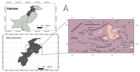 - Ashraf, M.; Dawood, H. Geology of Acid and Alkalic Minor Bodies Associated with Granitic and Alkalic Complexes of Malakand Division. Geol. Bull. Punjab Univ. 2010, 45, 49–68. [Google Scholar]