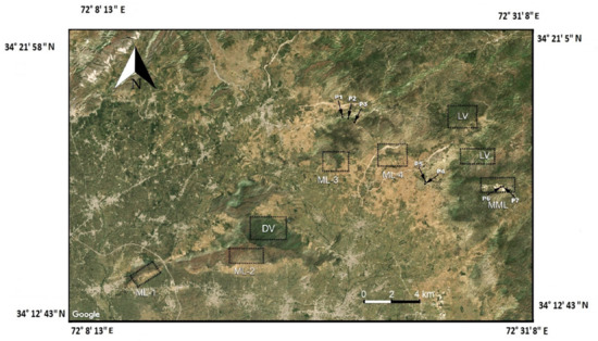 Locations of granite leases (ML-1 and ML-2) at Shewa Shahbazghari, granite leases (ML-3 and ML-4), and marble mining leases (MMLs) at Ambela Complex. The regions of dense vegetation (DV) and light vegetation (LV) are overlaid on the Sentinel-2 Multispectral Instrument (MSI) mosaicked image. Seven points P1–P7 show different validation points during the field visit.