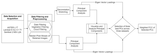 Analytical techniques for RS are grouped into data-driven and knowledge-based techniques [15]. Several techniques, such as band ratios [16,17], band ratio matrix transformation (BRMT) [18], spectral angle mappers (SAM) [19,20], decorrelation stretching (DS) [17,21], principal components analysis (PCA) [17,22,23], directed principal component analysis (DPCA) [24], feature-oriented principal components selection (FPCS) also known as Crosta technique [25,26,27], spatially weighted PCA [28,29], directed PCA [30,31], and other variants of PCA [32], have been reported for mapping different lithological [33] and environmental [34] features. Recently, Support Vector Machine (SVM), PCA, and independent component analysis (ICA) have been used to map gold-bearing granite-greenstone rocks using AVIRIS-NG hyperspectral and ASTER data [35].
