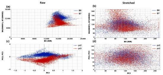 (a) Scatter plots showing the effects of the principal component analysis (PCA) and decorrelation stretching of Landsat-8 OLI bands pixel data (raw Landsat-8 B5 (NIR) vs. B6—SWIR1 (blue), and B7—SWIR2 (red)); (b) scatter plots of B5 (NIR) vs. B6—SWIR1 (blue), and B7—SWIR2 (red) after the application of decorrelation stretching on raw Landsat-8 data; (c) scatter plots of PC1 vs. PC2 (blue) and PC3 (red) after the application of PCA on the raw Landsat-8 datasets; and (d) Scatter plots of PC1 vs. PC2 (blue) and PC3 (red) after the application of PCA on the stretched Landsat-8 datasets.