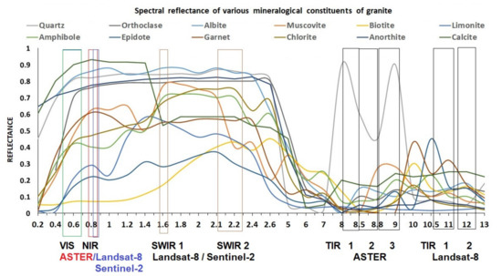 The Landsat-8 Operational Land Imager (OLI) consists of 6 visible and near-infrared (VNIR), two shortwave infrared (SWIR), and one panchromatic sensors with 30 m, 30 m, and 15 m resolutions, respectively. The Landsat-8 Thermal Infrared Sensor (TIRS) has two TIR bands of a 100 m spatial resolution available at the 30 m resolution in Google Earth Engine (GEE). In comparison, the Advanced Spaceborne Thermal Emission and Reflection Radiometer (ASTER) has 14 bands, i.e., 3 VNIR bands with a 15 m resolution, 6 SWIR bands with a 30 m resolution, and 5 TIR bands with a 90 m resolution [4]. However, the radiometric response of SWIR bands from the ASTER is unreliable after 2008 due to a technical fault [5]. The Sentinel-2 Multispectral Instrument (MSI) has a relatively higher (20 m) spatial resolution for SWIR bands, but no TIR bands [6,7]; therefore, further studies are needed to explore its capabilities for mineral exploration [8]. The Sentinel-2 MSI has a resolution of 10–20 m, but it lacks TIR bands, whereas the Landsat-8 TIRS has TIR bands, but its resolution is 100 m. However, GEE can convert bands to the exact spatial resolution by resampling, e.g., 100 m TIR bands are available as 30 m by default in its database. The TIR emissivity for igneous rocks decreases with the high silica content, while a corresponding shift in absorption to a higher wavelength band is observed in the mineral groups due to types of dominant silicates [4]. The minimum TIR emissivity of granite at 9 µm is due to the vibration absorption of the Si–O silicate structure, which shifts to 11 µm in mafic rocks having a tectosilicate structure [4,9,10]. However, TIR satellite sensors have low temporal, spatial, and spectral resolutions, and the spectral responses in these bands may contain a mixture of features [11]. Vegetation or soil cover may cause high variation in granite spectral response, making it challenging to map the deposits [4,12]. High-spatial-resolution SWIR bands show spectral absorption for different granite compositions (e.g., muscovite and epidote) and calcite in 2.2 μm regions; a complete absorption is only observed for calcite near the 2.3 μm regions [4,10]. The fusion of TIR with other high-resolution SWIR datasets can provide insight into understanding different features [4,11,13]. Integrating results from multiple sources, e.g., the Landsat-8, the Sentinel-2, and the ASTER, by a suitable criterion would generally improve the outcome compared to single-source data [14].