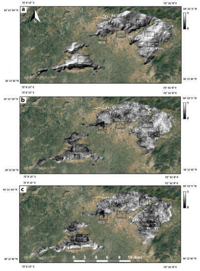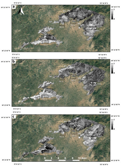 A binarized normalized difference vegetation index (NDVI) was calculated and overlaid on the final map for comparison, which showed pixels containing of >0.5 NDVIs in black and pixels containing less than 0.5 NDVIs in white color (as seen in Figure 11). Granite having no vegetation cover was visible in sky-blue and sea green. The dark reddish black color at the MML region showed the marble mining areas, while the dark sky-blue color near P4, P5, and ML-3 indicated the granite with scree, clay, and disturbed land area, respectively, due to weathering. The results from our proposed methodology (Figure 10a) correctly identified all granite and marble known locations compared to the FPCS of the stacked raw (Figure 10b) and stretched (Figure 10c) bands, identifying 5 and 10 out of the 11 locations, respectively.