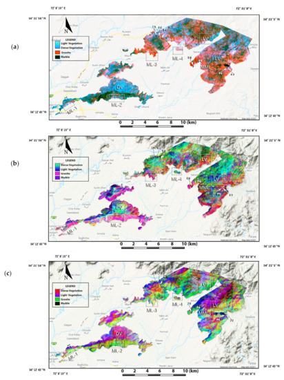 The validation of the results with granite (locations ML-1–ML-4), MMLs, and field visit locations (P1–P7) of the Shewa Shahbazgarhi and Ambela complexes are shown in Figure 10. The final map (shown in Figure 10a) was obtained by the FCCs of a weighted combination of PC3 obtained from the FPCS of the stretched Sentinel-2 MSI data, PC4 of the raw Landsat-8, and PC3 of the stretched Landsat-8 datasets. PC3 of the stretched Sentinel-2 MSI component was assigned a weight of 1.5, and PC3 of Landsat-8 stretched datasets had more matching with the target (granite/marble) than the raw Landsat-8 data. Therefore, it was assigned ¾ of the remaining 0.5 weight, i.e., 1.125, and PC4 of the raw Landsat-8 datasets was weighted as 0.375. Figure 10b,c shows the results obtained by applying PCA on stacking all bands of the raw and stretched ASTER, Sentinel-2, and Landsat-8 OLI and TIR sensors mentioned in Table 1. The results from the proposed method in Figure 10a showed a good correlation with ground truth locations compared to Figure 10b,c.