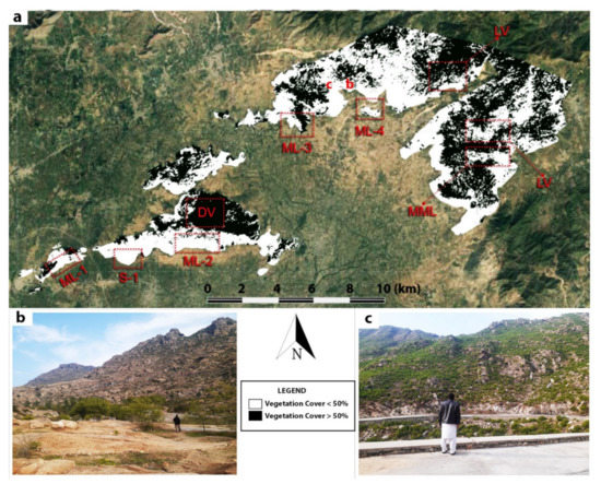 (a) Binarized normalized difference vegetation index (NDVI) of >0.50% showing pixels with higher vegetation cover in black color; (b) low vegetation region (72°21′48″ E, 34°19′44″ N); (c) medium vegetation region (72°21′8″ E, 34°20′13″ N).