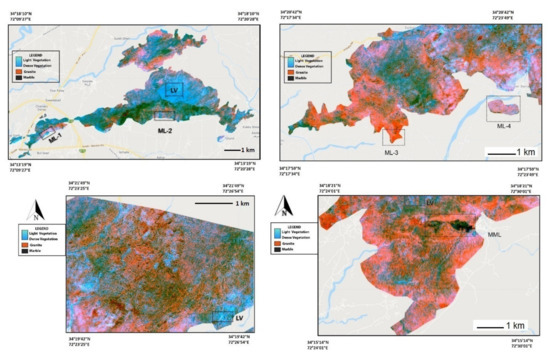 Zoomed-in areas of the study region showing MMLs and granite leases (ML-1–ML4) amongst low vegetated (LV) regions.