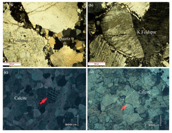 Petrographic and textural examination and characterization results of the sample rocks. The coordinates of samples: (a) P1: 72°20′31″ E, 34°20′26″ N; (b) P5: 72°24′17″ E, 34°17′51″ N; (c) P7: 72°28′10″ E, 34°17′37″ N; and (d) P6: 72°28′7″ E, 34°17′36″ N.