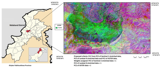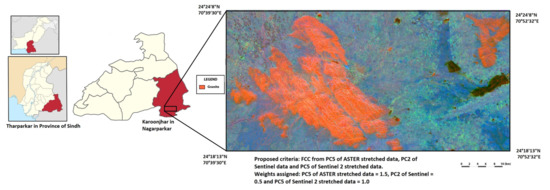 - The weighted PCs extrapolation to other granite outcrops across Pakistan showed the technique’s usefulness to obtain results with ease and accuracy. In less vegetated regions, i.e., the Kotah Dome, Malakand, and non-vegetated Karoonjhar Nagarparkar, the ASTER component was helpful due to the granite-specific TIR2 band. The advantage of Sentinel-2 components was highlighted in all case studies, which shows that high-spatial-resolution SWIR bands support TIR bands from the ASTER and/or Landsat in mapping granite and accessory minerals. The information about accessory granite minerals due to their spectral absorption in the SWIR2 band is incorporated in granite through the high-spatial-resolution Sentinel-2 components bearing high-resolution SWIR2 bands.