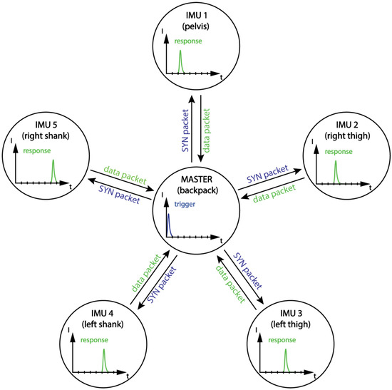 To collect information about the movement of human-body segments while walking, five real-time IMU motion tracking units were attached to the segments of a human’s lower limbs, and a master device was attached to a backpack worn by the subject. The devices were configured to communicate in a star-shaped network topology, shown in Figure 1. The structure of the network itself is very simple. The devices communicate in master-slave mode over the UWB radio channel. The device at the centre of the network, i.e., the master device, coordinates the response of the remote IMU devices by sending the triggering packet to which each IMU device responds in a timed manner. The set of devices constitutes the WSA facility for providing real-time feedback of the sensory information while walking.
