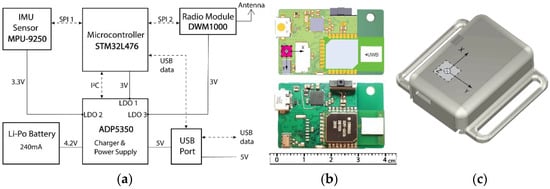 Figure 2 shows the block diagram of a single IMU unit. The hardware design of the master and remote units IMU is electrically identical, and their operating mode is configured by a firmware setting. The 4 × 2.5-mm devices are housed in a wearable 3D-printed plastic case that can be easily attached to clothing or human-body parts with elastic straps (see Figure 2c). The IMU size is 40 mm × 25 mm with weight of 5 g, production cost with all elements is around 75 EUR each in 100 pc. batch. Same size and weight is for 240 mAh Li-Po battery, cost in range of 6 EUR. The housing is dedicated custom design 3D printed with FDM technology.