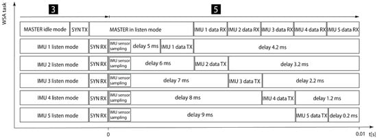Figure 4. WSA tasks sequences in a single 10-ms sample cycle. - Sampling protocol—time-slot division, master side: The protocol for sampling sensors and communication between the WSA devices uses the simple principle of time-slot division. Each remote device was assigned its own time slot when responding with the sensor payload. To begin sampling, the master device sends “wake-up” packets via the USB port, whereupon the master’s loop timer is started. The loop timer in the master device sends synchronization packets at intervals that are multiples of 10 ms. The synchronization interval is user configurable and was set to 30 ms.